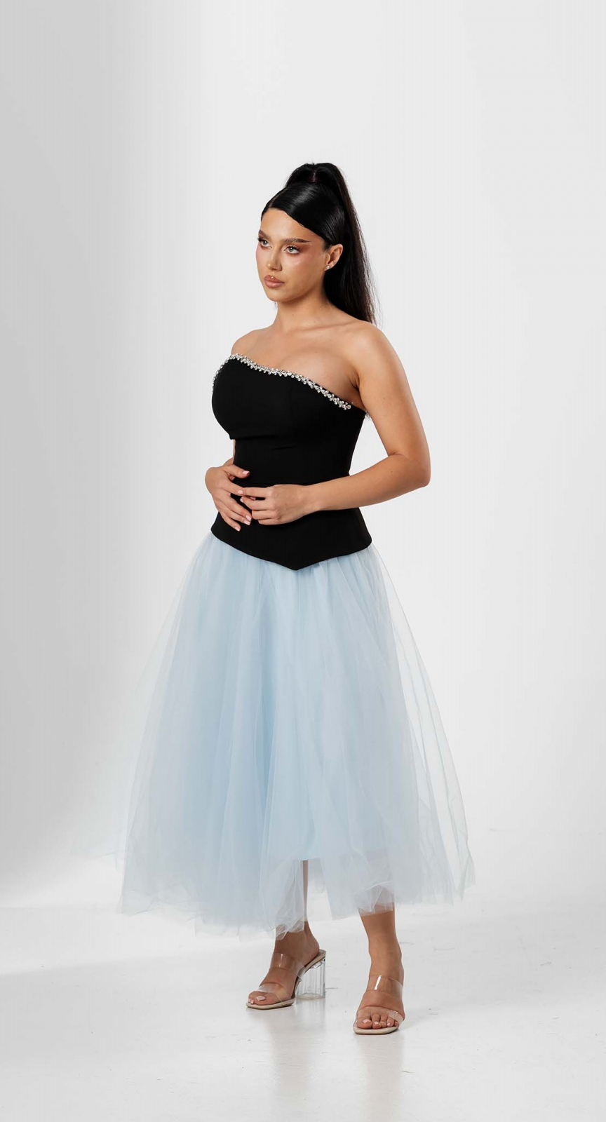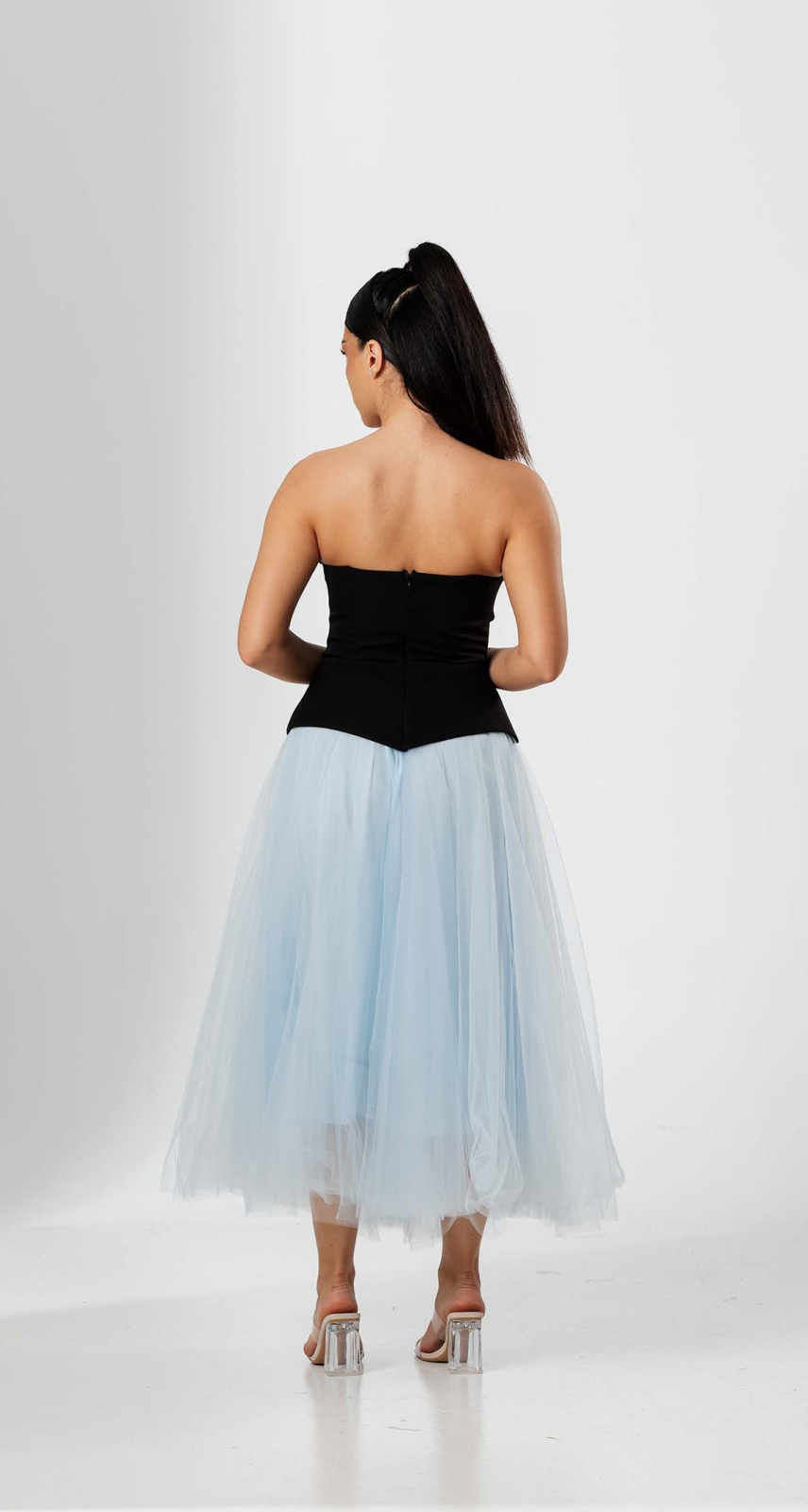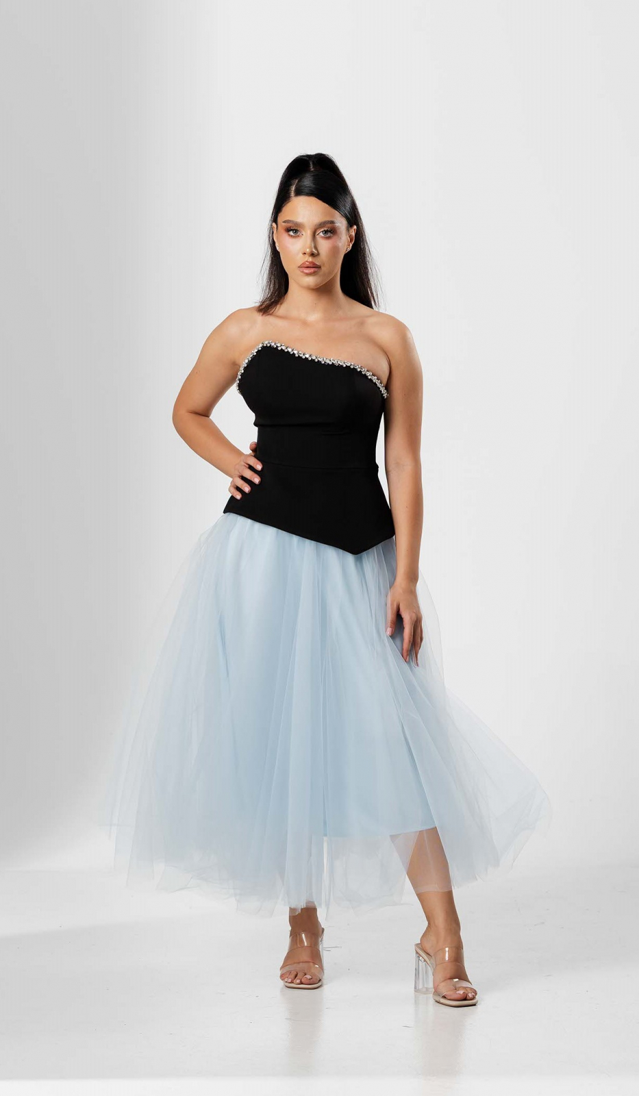 Un compleu cu impact vizual, compus din bustieră cu design asimetric și aplicații fine care pun în valoare linia decolteului, și fustă midi din tull cu volum generos. Bustiera, cu o croială structurată, conturează silueta, iar fusta diafană adaugă un aer teatral și sofisticat. Alegerea perfectă pentru momente în care vrei să impresionezi.