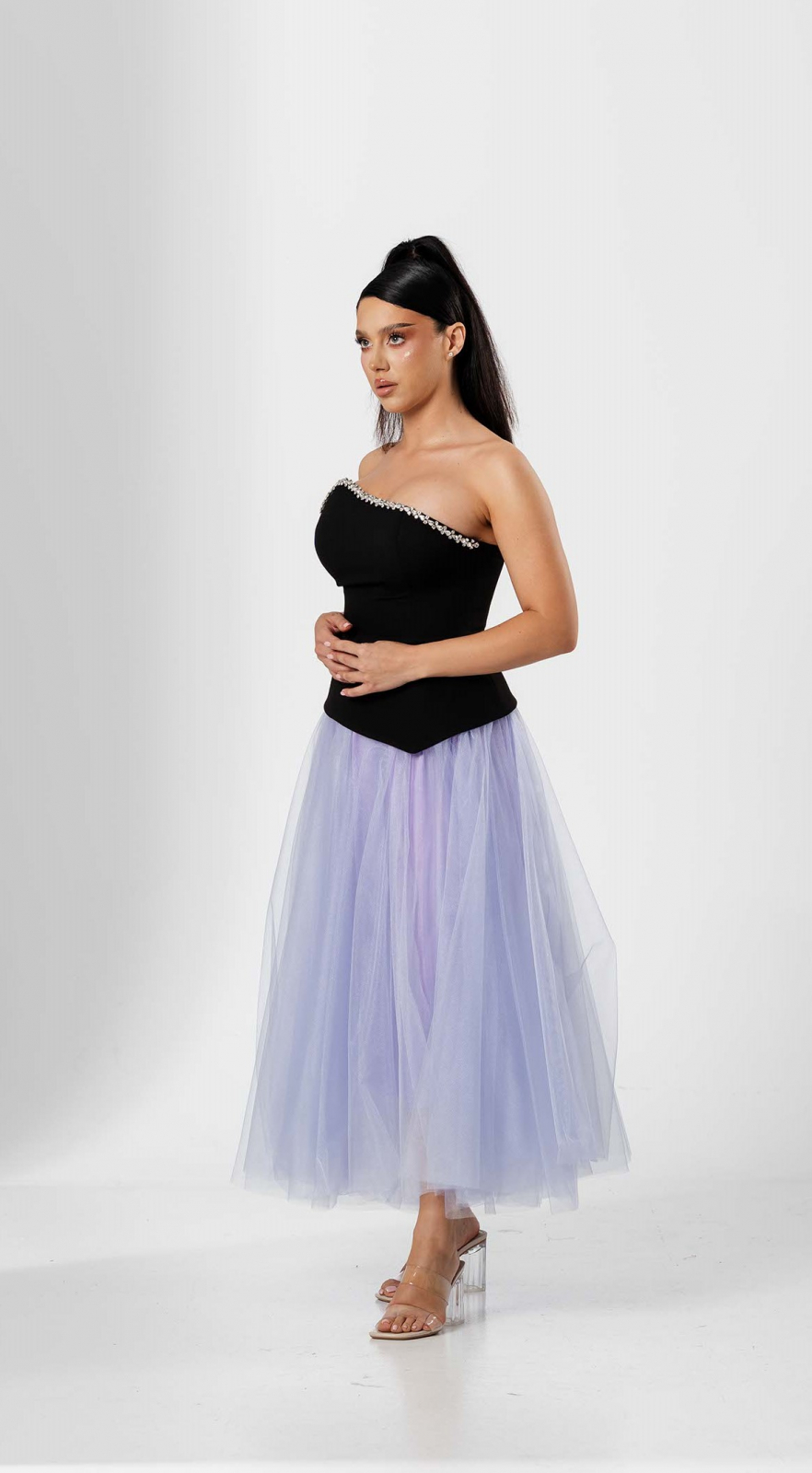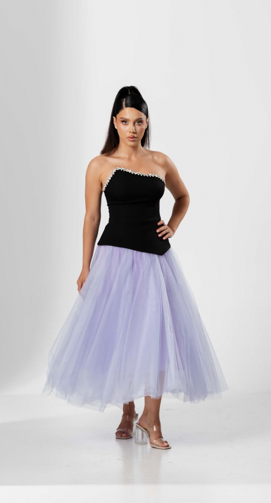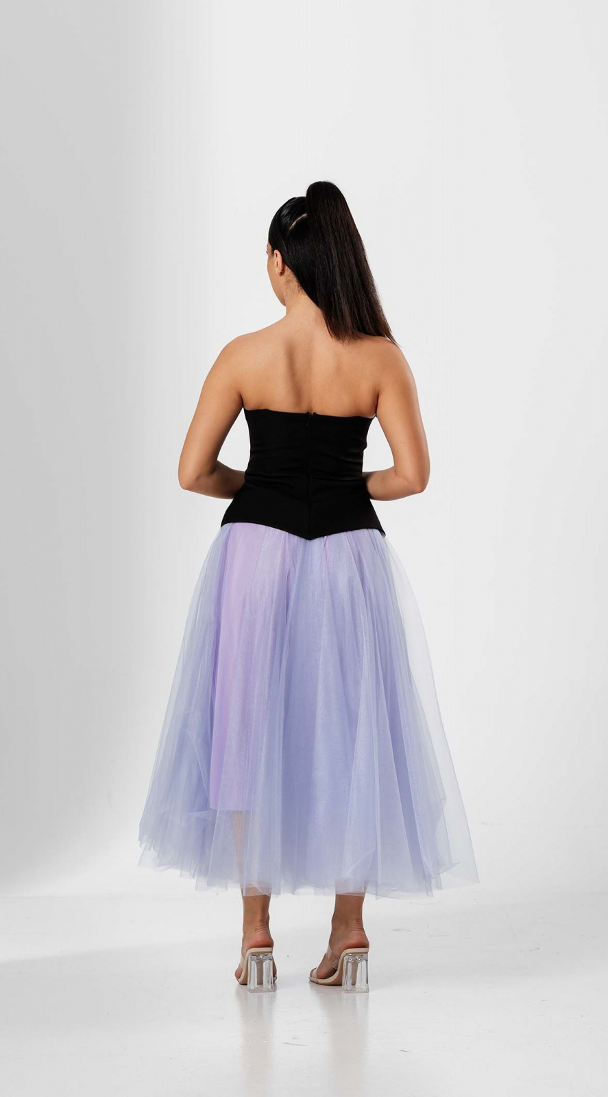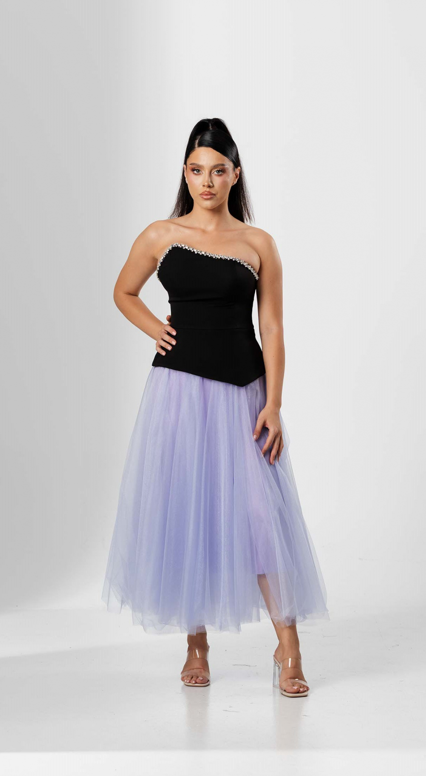 Un compleu cu impact vizual, compus din bustieră cu design asimetric și aplicații fine care pun în valoare linia decolteului, și fustă midi din tull cu volum generos. Bustiera, cu o croială structurată, conturează silueta, iar fusta diafană adaugă un aer teatral și sofisticat. Alegerea perfectă pentru momente în care vrei să impresionezi.