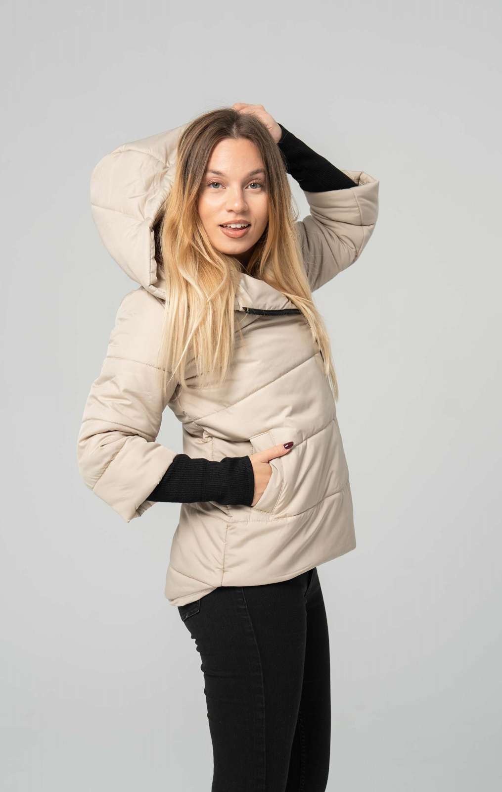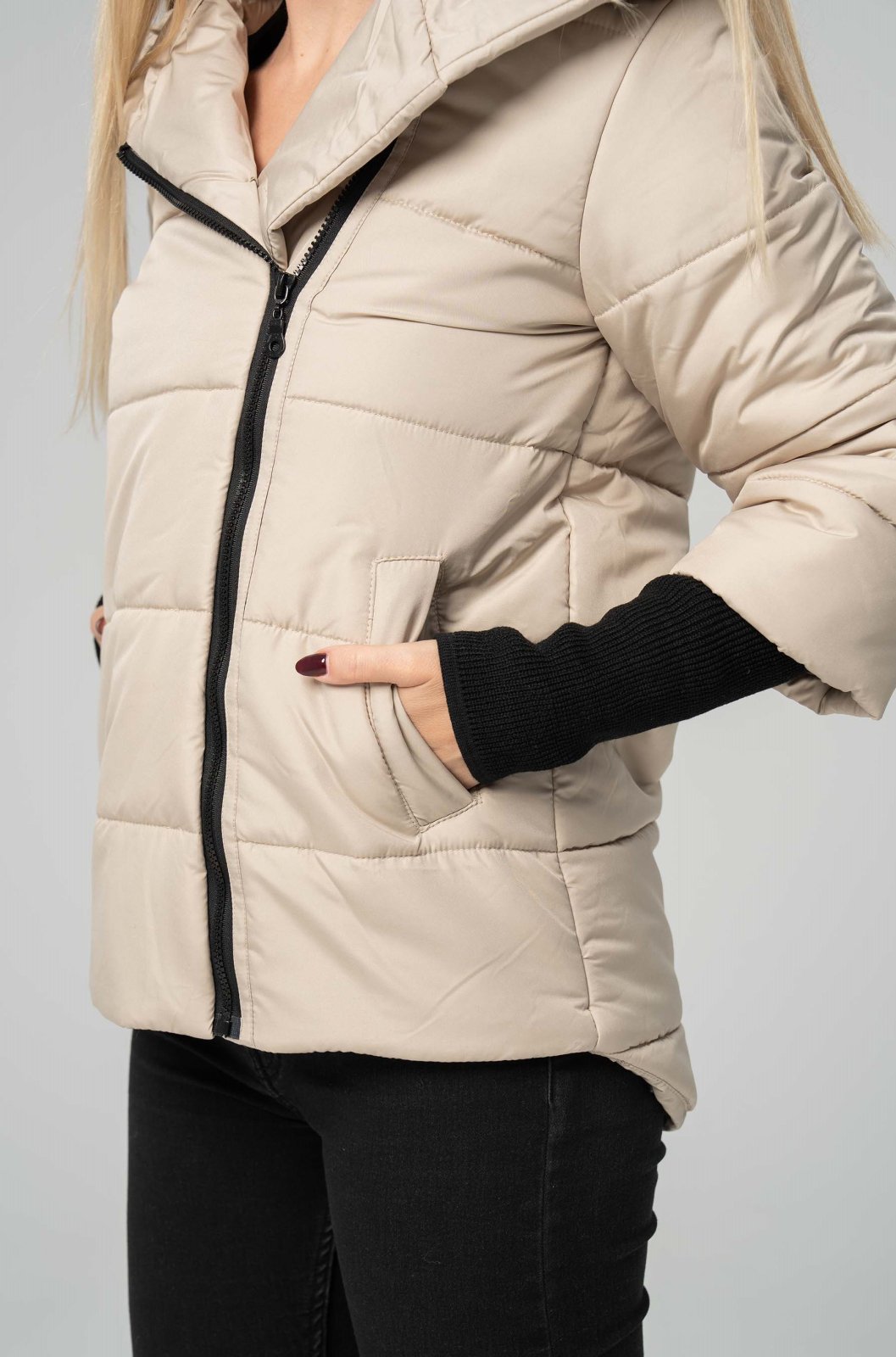 O piesă versatilă și elegantă, o geacă matlasată, bej, este ideală pentru un look urban, modern și plin de stil. Croiala lejeră, de tip bomber, și fermoarul lateral, asimetric, o transformă într-o declarație de stil. Gluga integrată și manșetele elastice, de culoare neagră, sunt detalii ce te protejează eficient de frig, în timp ce matlasajul asigură o izolație termică optimă.