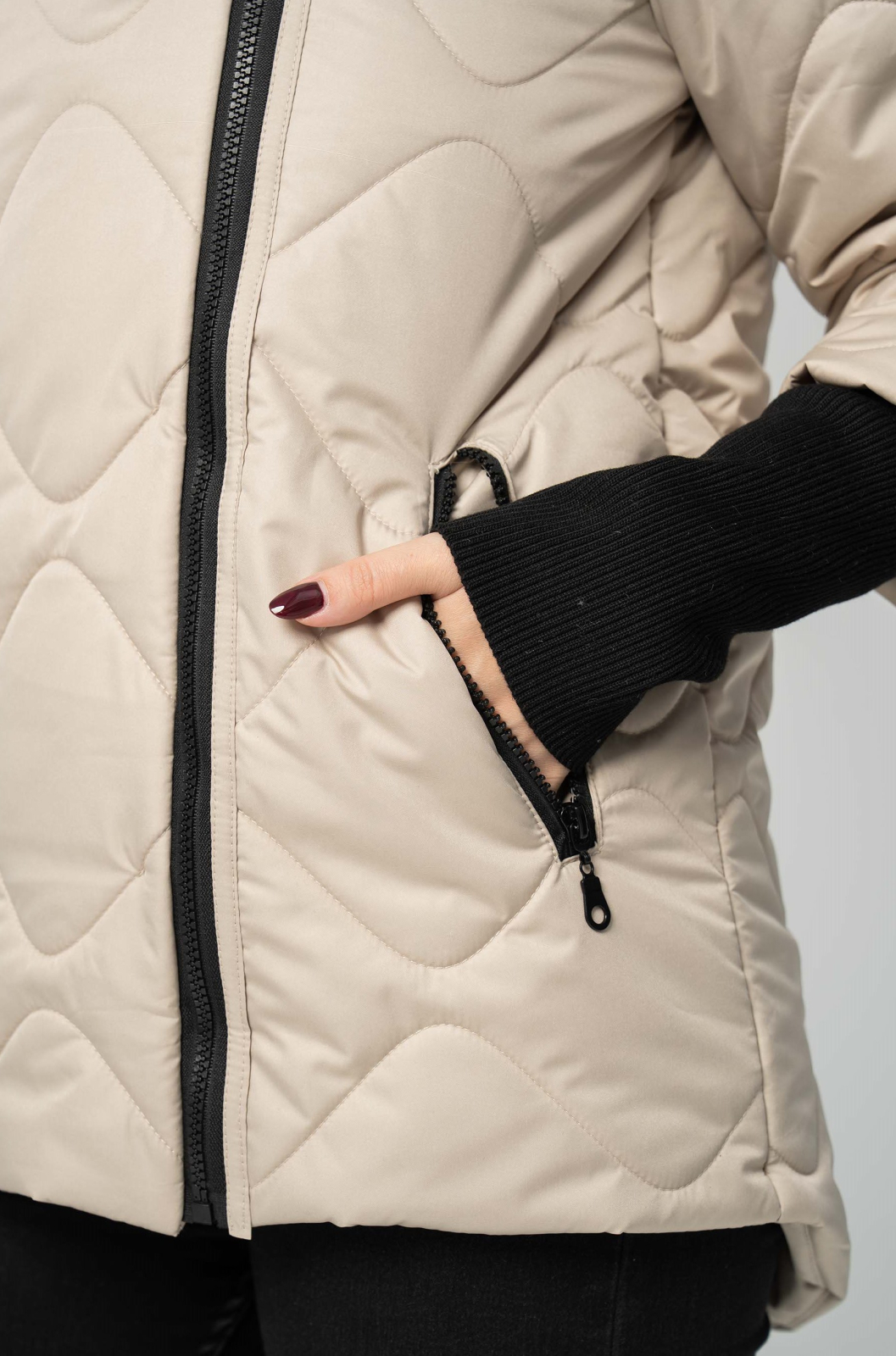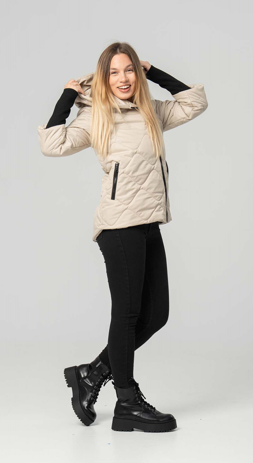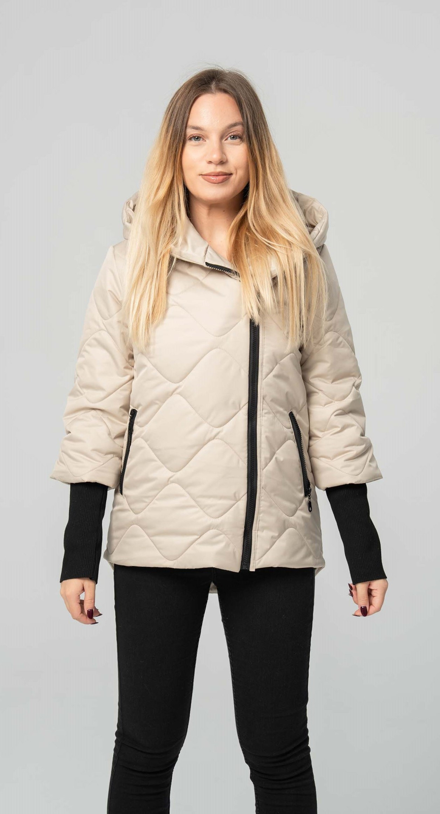 Descoperă o piesă vestimentară perfectă pentru a-ți completa ținutele de toamnă. Cu o nuanță elegantă de bej, modelul scurt, matlasat, aduce un plus de rafinament oricărui stil. Fermoarul lateral, asimetric, și croiala lejeră, de tip bomber, oferă un look tineresc și dinamic, iar gluga integrată și manșetele elastice, de culoare neagră, te protejează eficient de frig.