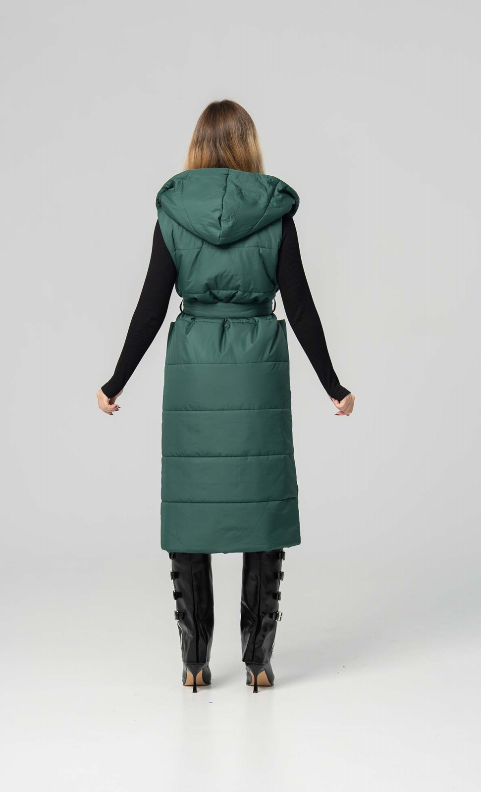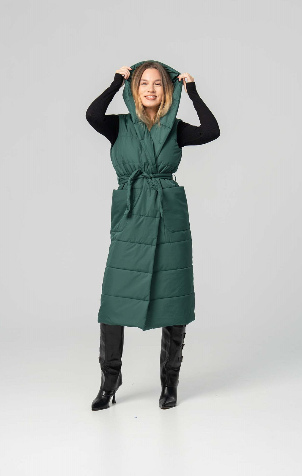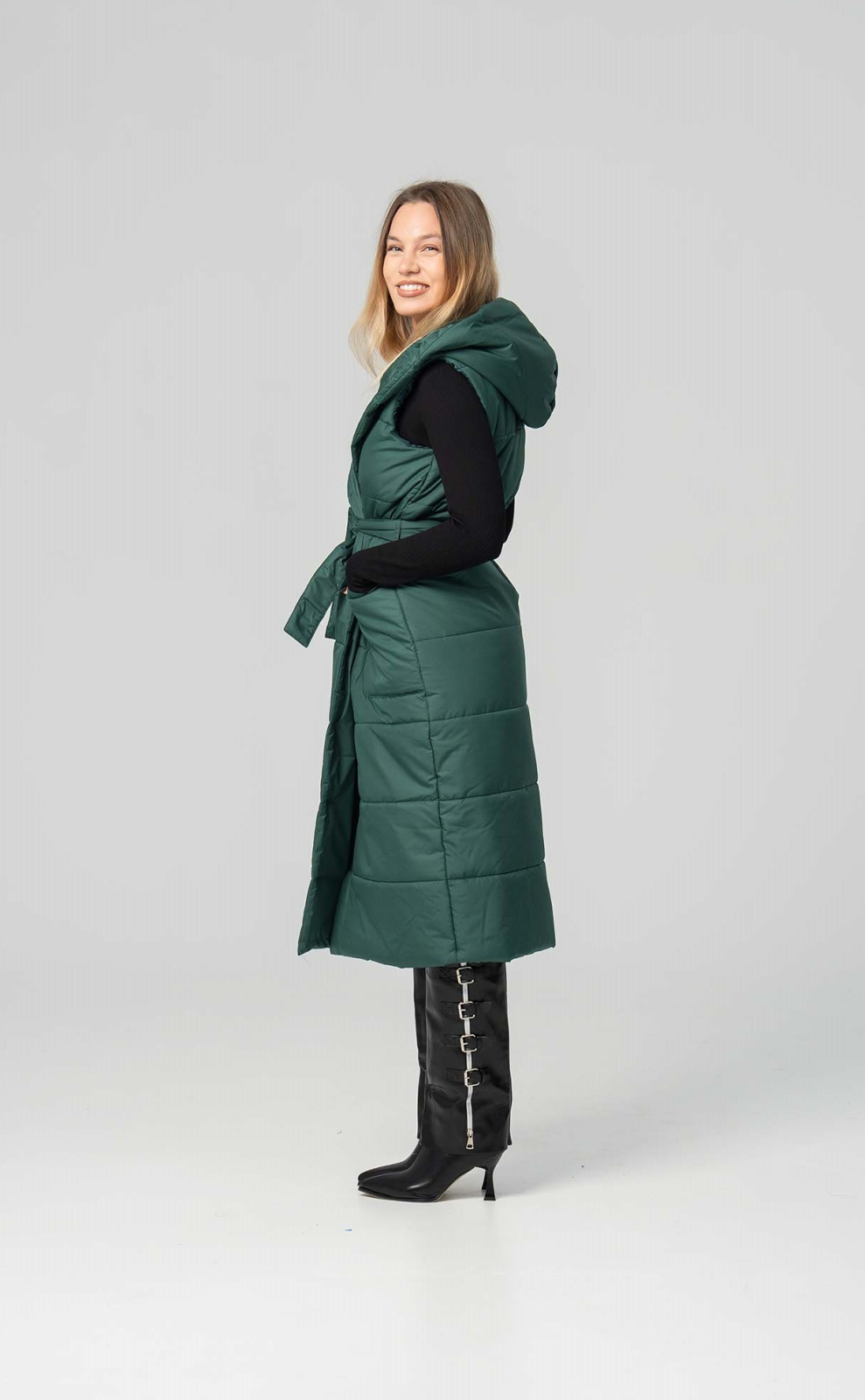 Această vestă lungă matlasată de damă, de un verde elegant, este piesa esențială pentru un stil urban, modern și practic. Designul său versatil, completat de o glugă voluminoasă și o croială lejeră, te protejează de frig fără a sacrifica eleganța. Cordonul în talie accentuează silueta și transformă vesta într-o ținută impecabilă, perfectă pentru zilele răcoroase de toamnă și iarnă.