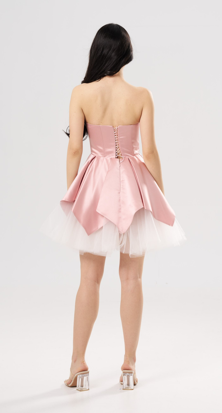 Rochie eleganta scurta AMALIA cu bust tip corset si fusta din tull, roz