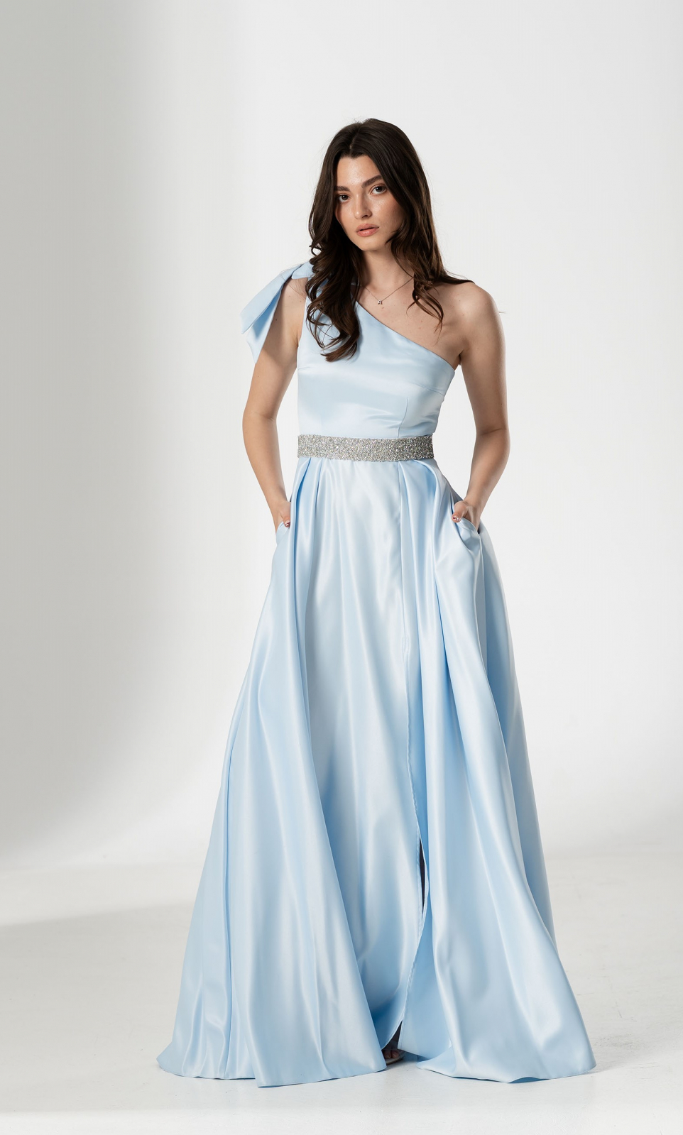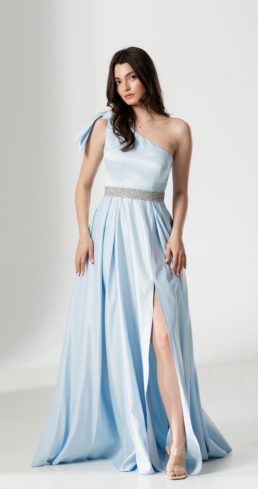 Rochie de seara cu o croiala asimetrica si un design modern, ce evidentiaza eleganta printr-un umar gol si un slit adanc pe picior. Talia este accentuata de o centura decorativa, iar materialul satinat ofera fluiditate si un plus de rafinament intregii tinute. Ideala pentru evenimente speciale in care vrei sa impresionezi cu stil si atitudine.