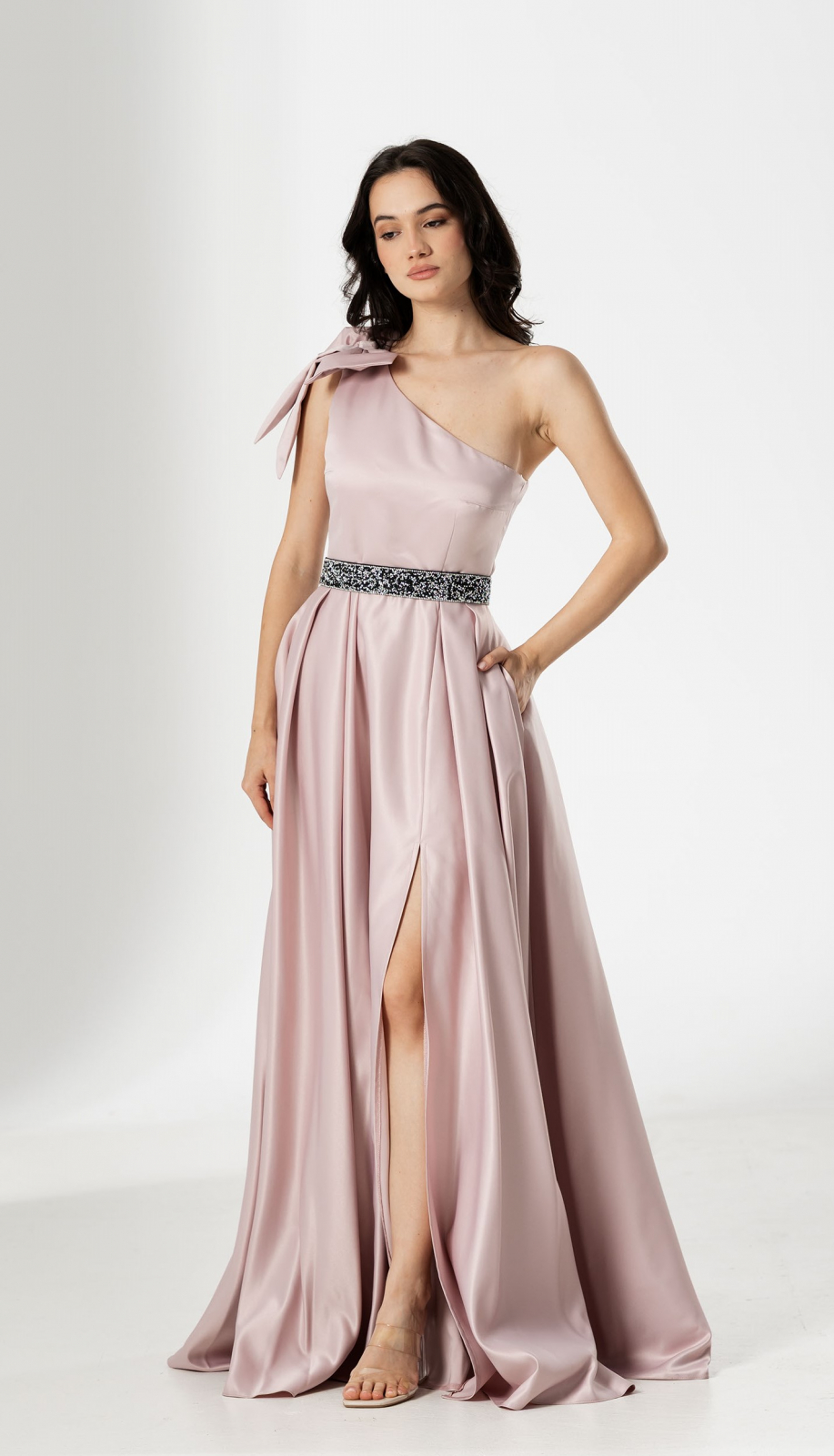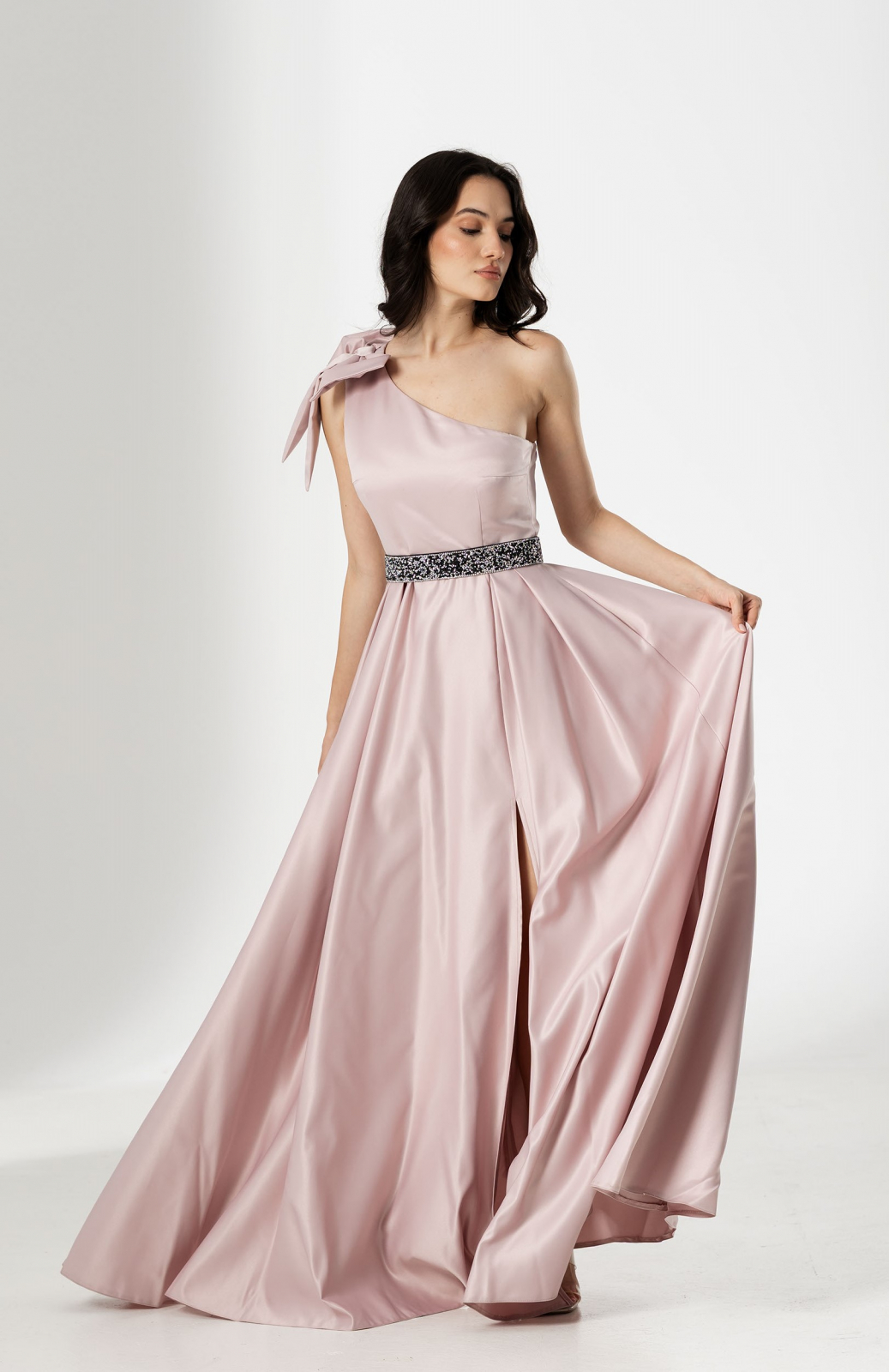Rochie de seara cu o croiala asimetrica si un design modern, ce evidentiaza eleganta printr-un umar gol si un slit adanc pe picior. Talia este accentuata de o centura decorativa, iar materialul satinat ofera fluiditate si un plus de rafinament intregii tinute. Ideala pentru evenimente speciale in care vrei sa impresionezi cu stil si atitudine.