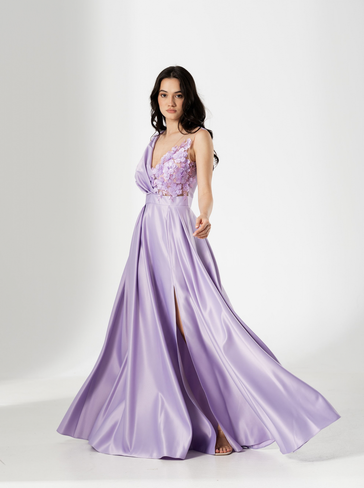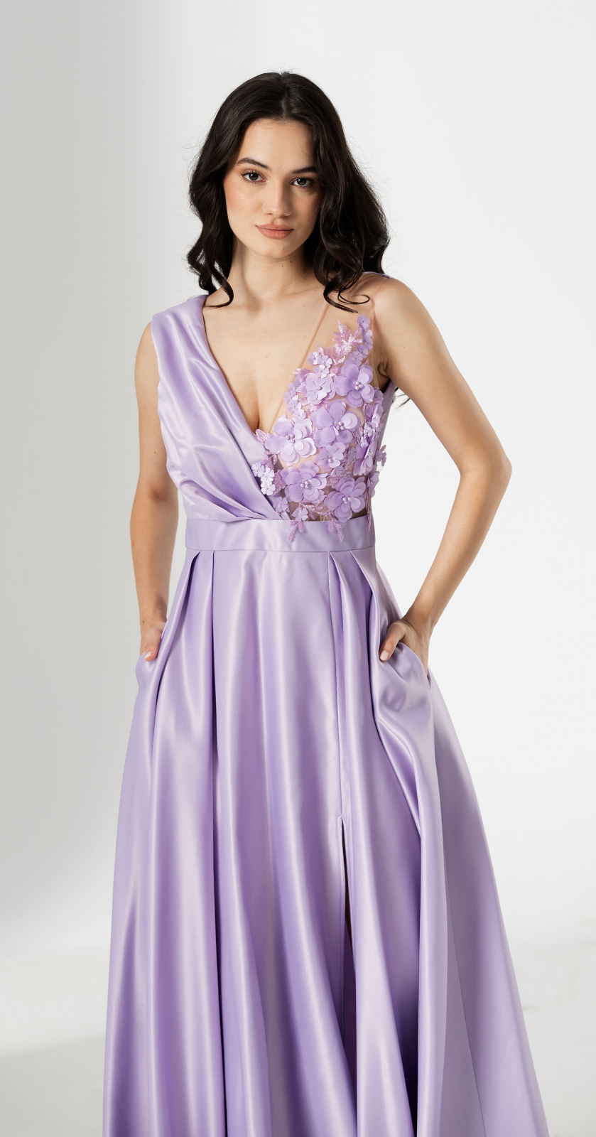 Rochie lunga de ocazie, cu un design sofisticat si feminin, evidentiat de decolteul petrecut si aplicatiile florale 3D pe un piept. Croiul lejer al fustei, cu deschidere pe picior, ofera libertate de miscare si un plus de eleganta, in timp ce materialul satinat reflecta discret lumina, accentuand rafinamentul tinutei.
