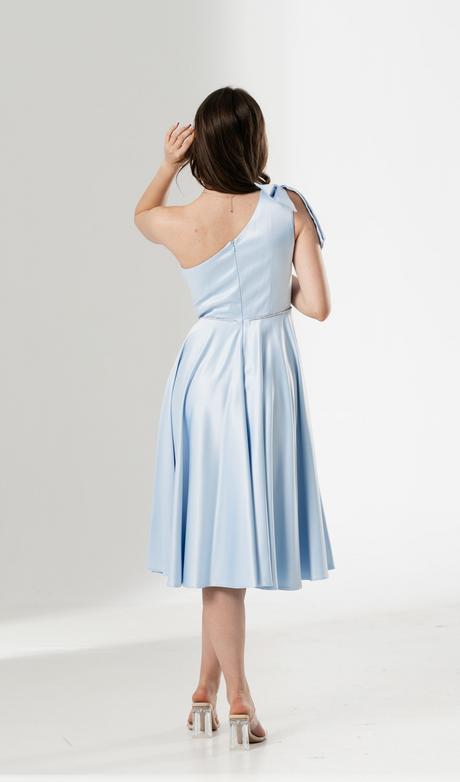 Rochie midi cu un design asimetric, ce evidentiaza linia umerilor printr-un singur umar descoperit si o funda pe celalalt. Talia este marcata subtil cu o banda decorativa delicata, iar fusta clos ofera un aer feminin si gratios. O piesa rafinata, ideala pentru evenimente speciale sau ceremonii.
